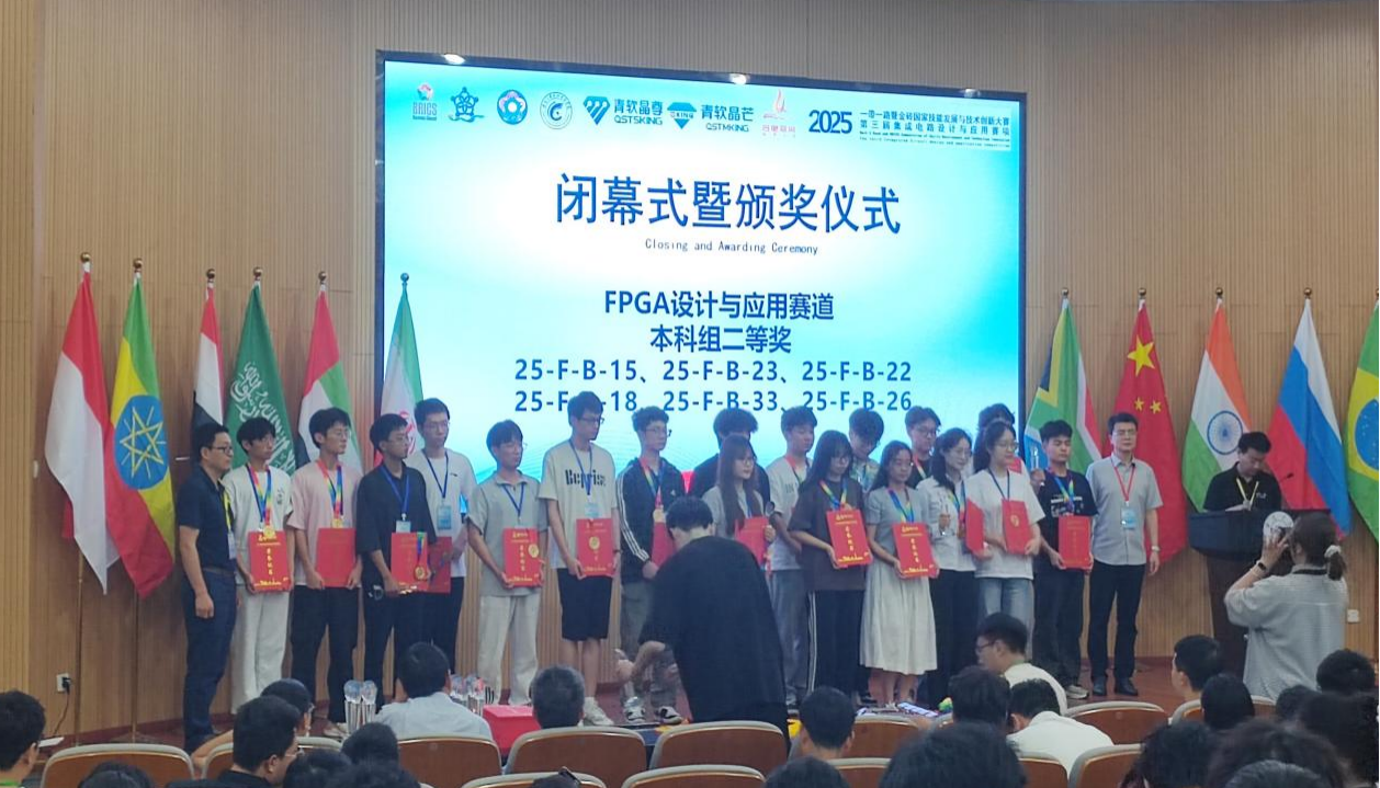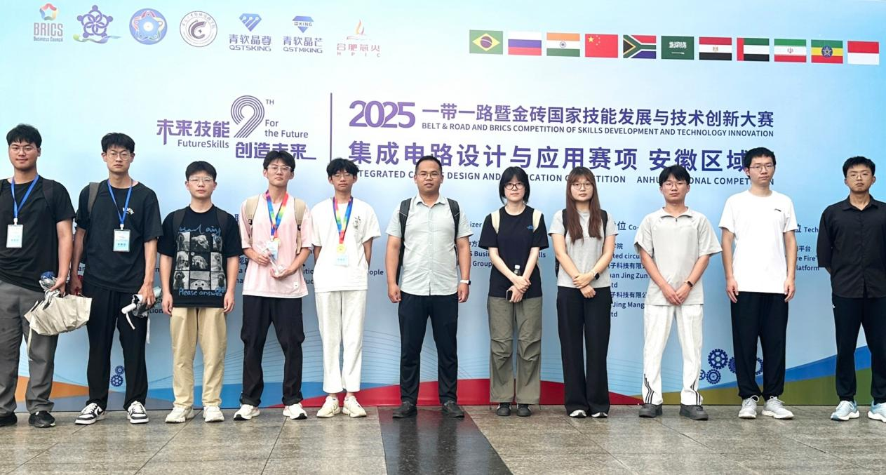 6月8日,2025“一带一路”暨金砖国家技能发展与技术创新大赛之集成电路设计与应用赛项安徽区域赛在安徽大学水上报告厅圆满落幕。本次大赛吸引了众多省内高校的积极参与,竞争异常激烈。我院遴选出五支参赛队伍,在FPGA设计与应用赛道与来自安徽大学、安徽理工大学、安徽工业大学和安徽建筑大学等省内兄弟院校的几十支队伍展开了激烈角逐。