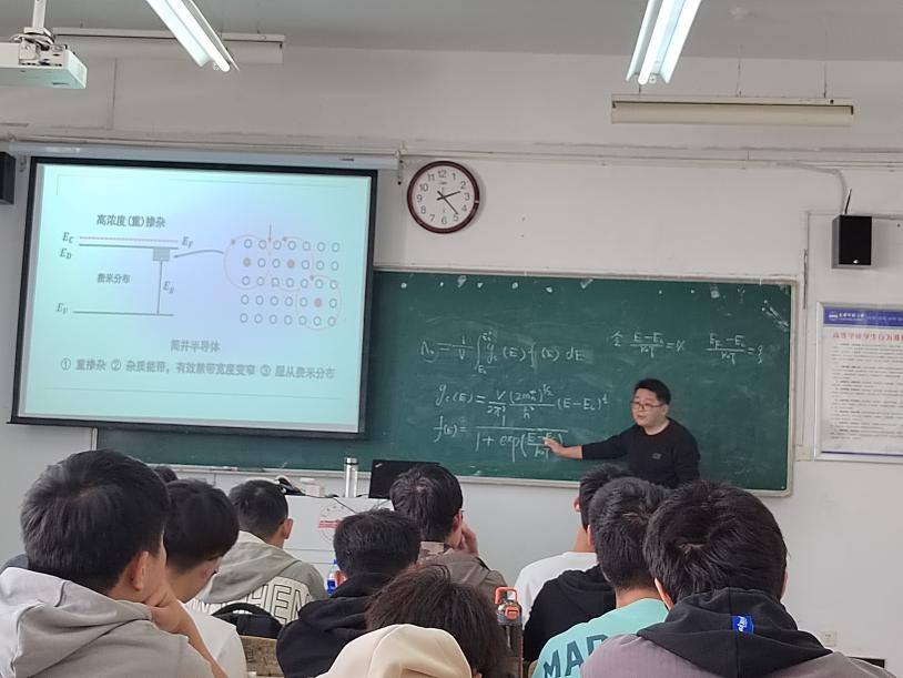 吴义恒老师首先复习了上次课所讲的“本征半导体载流子浓度”、“杂质半导体载流子浓度”等重点内容,并根据非简并半导体知识引出本节课内容——“简并半导体”。导入新课后,重点讲授了“本征半导体的特性”和“本征半导体载流子浓度的求解过程”等内容。课堂师生互动积极、气氛热烈,充分调动了学生对基本专业知识理论的学习热情。在课程中穿插介绍了半导体行业发展现状及黄坤先生对我国半导体发展的杰出贡献,融入思政要素,引导学生不忘初心,砥砺前行,始终保持谦虚谨慎、勤奋刻苦的工作作风,立足本职,争创一流,以更加饱满的热情投入到工作中去,为实现中华民族伟大复兴做作出贡献。课后,吴义恒老师与参与观摩的教师就《半导体物理学》课程的教学方法进行了深入的交流。这次教学观摩活动为教师们提供了交流学习的机会,有助于促进教师的教学水平和人才培养质量的不断提升。(撰稿:祝祖送 审核:章礼华)