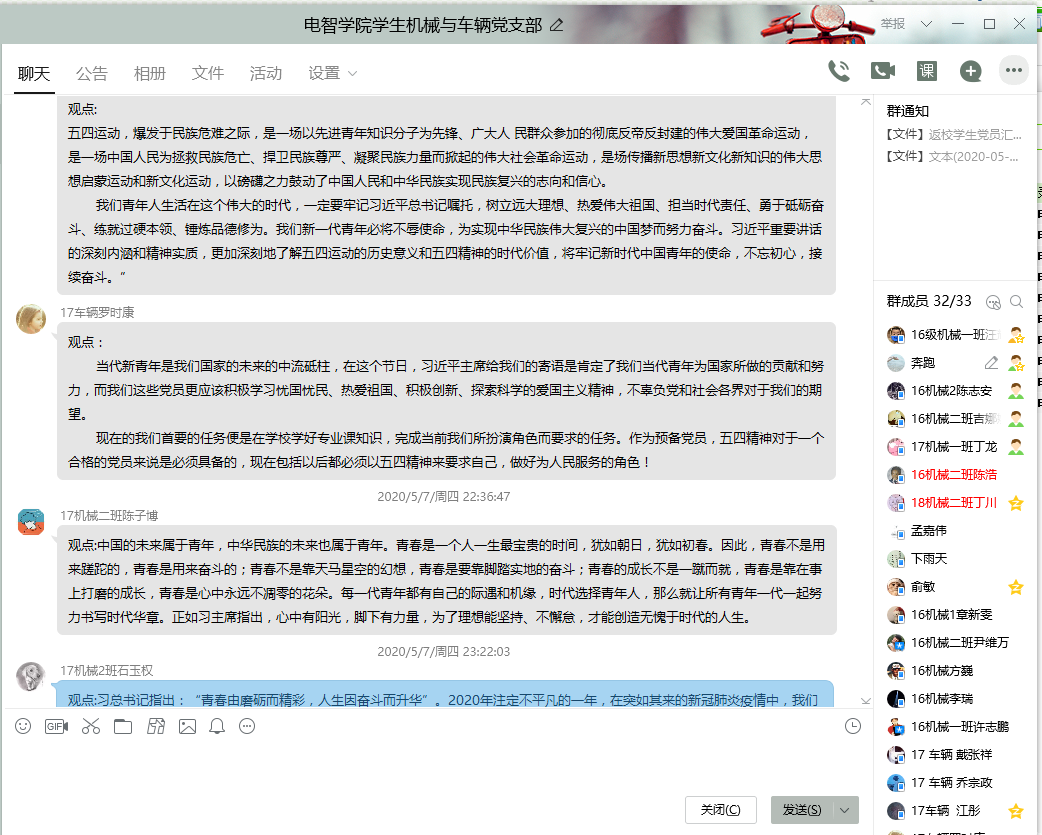 机械2016级尹维万说:五四运动,爆发于民族危难之际,是一场以先进青年知识分子为先锋、广大人民群众参加的彻底反帝反封建的伟大爱国革命运动,是一场中国人民为拯救民族危亡、捍卫民族尊严、凝聚民族力量而掀起的伟大社会革命运动,是场传播新思想新文化新知识的伟大思想启蒙运动和新文化运动,以磅礴之力鼓动了中国人民和中华民族实现民族复兴的志向和信心。我们青年人生活在这个伟大的时代,一定要牢记习近平总书记嘱托,树立远大理想、热爱伟大祖国、担当时代责任、勇于砥砺奋斗、练就过硬本领、锤炼品德修为。我们新一代青年必将不辱使命,为实现中华民族伟大复兴的中国梦而努力奋斗。习近平重要讲话的深刻内涵和精神实质,更加深刻地了解五四运动的历史意义和五四精神的时代价值,将牢记新时代中国青年的使命,不忘初心,接续奋斗。(学生机械与车辆工程党支部)