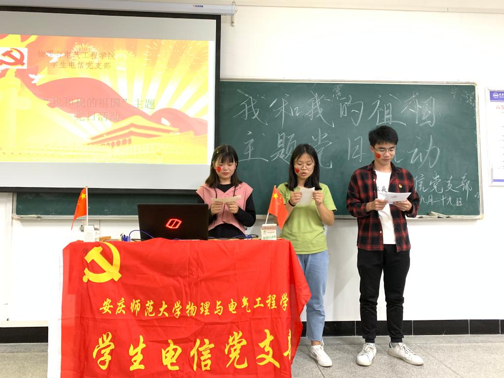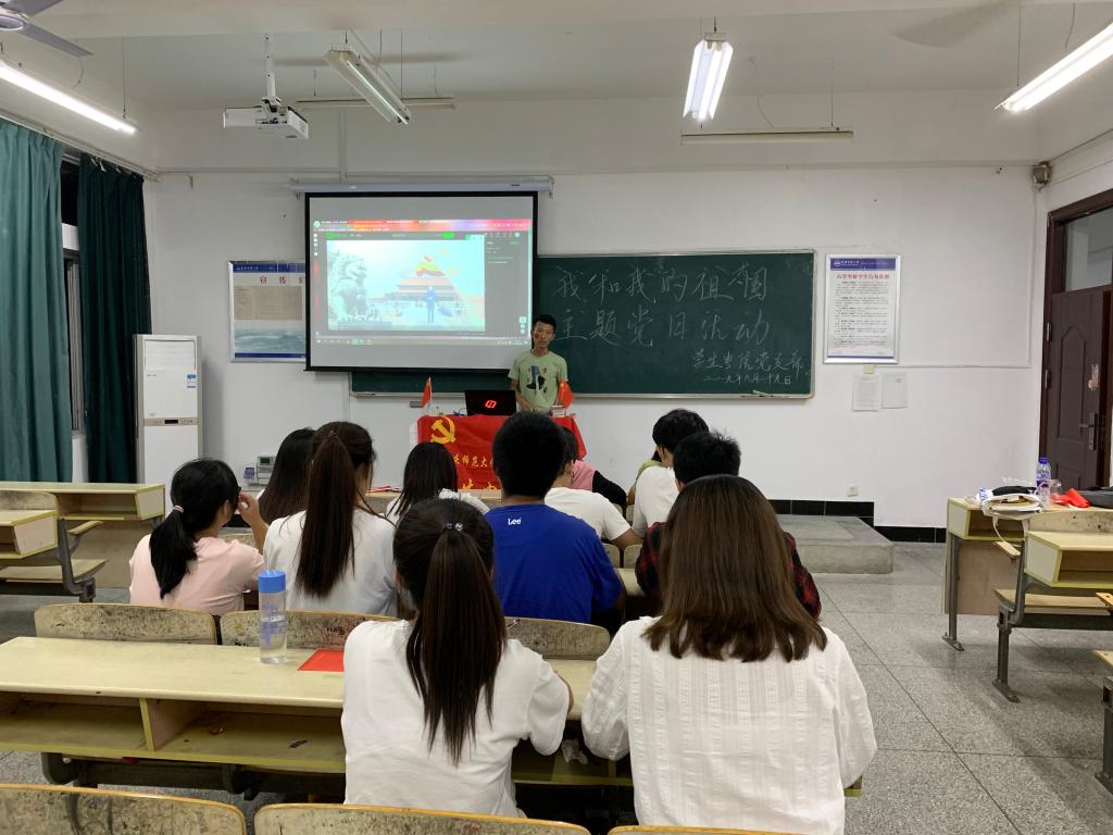 根据学校和学院“不忘初心、牢记使命”主题教育工作安排,为庆祝新中国成立70周年,加强支部党员的思想道德教育,激发党员的爱国主义情怀,2019年9月29日,学生电信党支部在B412开展了“我和我的祖国”主题党日活动。支部全体党员和部分入党积极分子参加了活动。