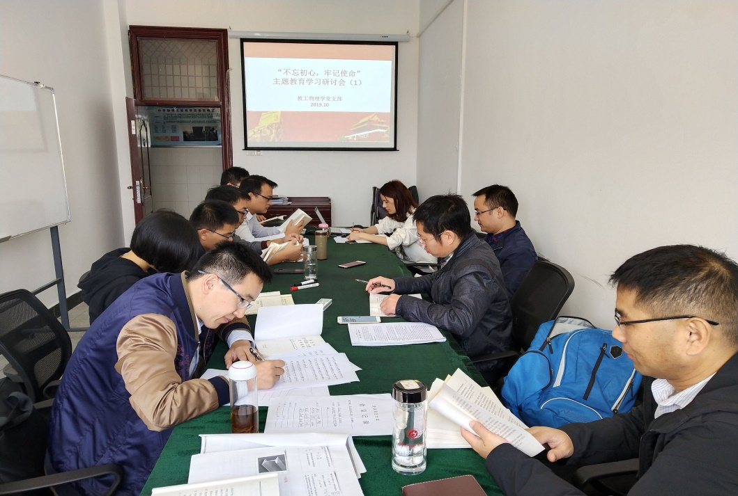 10月14日,教工物理学党支部在稼先楼北410开展了第一期“不忘初心,牢记使命”主题学习活动。在支部党员江燕燕和程飞的带领下,学习了“中国共产党人的初心和使命,就是为中国人民谋幸福,为中华民族谋复兴”和“新时代中国共产党的历史使命”。学习结束,支部书记潘盼首先发表学习体会,围绕大学老师的初心和使命表达了自己的思考和对学院发展的美好期盼。章礼华、闻军、吴兆旺和刘万芳等四位党员同志也分别发表了自己的学习体会。通过本次学习和讨论,将“不忘初心、牢记使命”的教育具体到自己的工作中,增强了党员老师为党育人、为国育才的意识,努力争做党和人民满意的好教师。(潘盼)