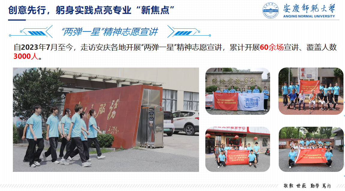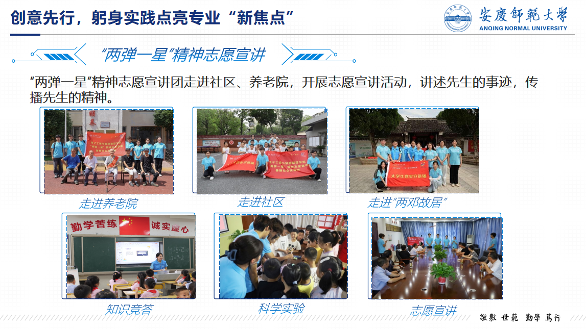 做人做事,立德为先。用真诚的态度做人,用真诚的行动做事。党团活动中,班级同学们虚心自省,积极完善自己,向党组织靠拢,目前班级预备党员2人,入党积极分子10人;在寒暑期社会实践中,他们深入大街小巷,调研民生热点,班级组建22支暑期社会实践团队,其中3支为校级重点团队。为了弘扬“两弹一星”精神,班级同学组建“两弹一星”志愿宣讲团,他们深入社区、学校、企业进行宣讲,宣讲场次60次,覆盖人数达3000人。
