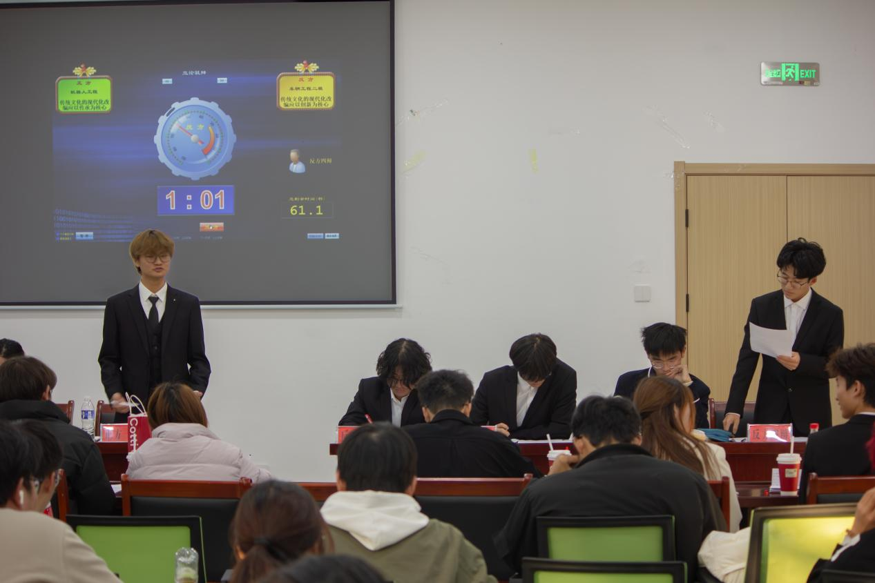 随后的冠亚军争夺战更是将现场气氛推向高潮。来自2025级的机器人工程一班(正方)与车辆工程二班(反方)就“传统文化的现代化改编应以传统为核心还是以创新为核心”这一辩题展开了深度博弈。