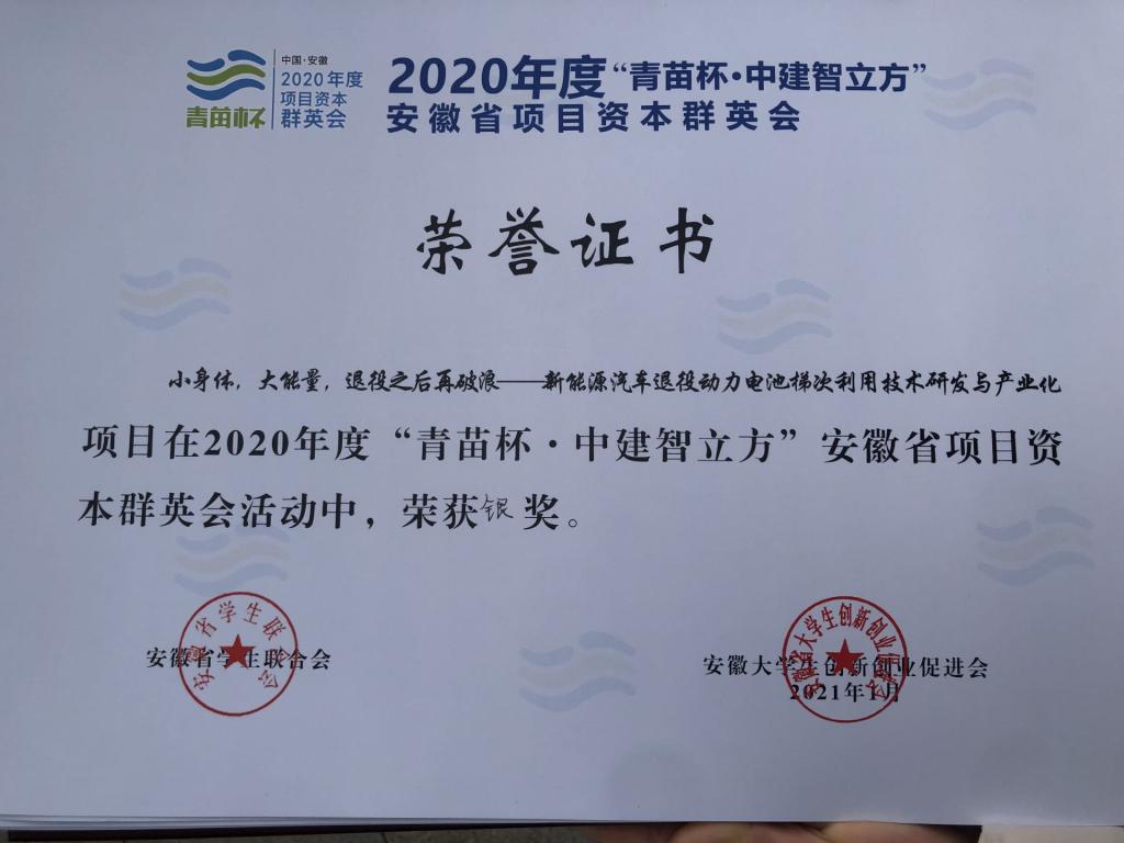 2020年度“青苗杯·中建智立方”安徽省项目资本群英会圆满落幕,我院由张朝龙博士指导的“小身体,大能量,退役之后再破浪-新能源汽车退役动力电池梯次利用技术与研发产业化”荣获银奖。