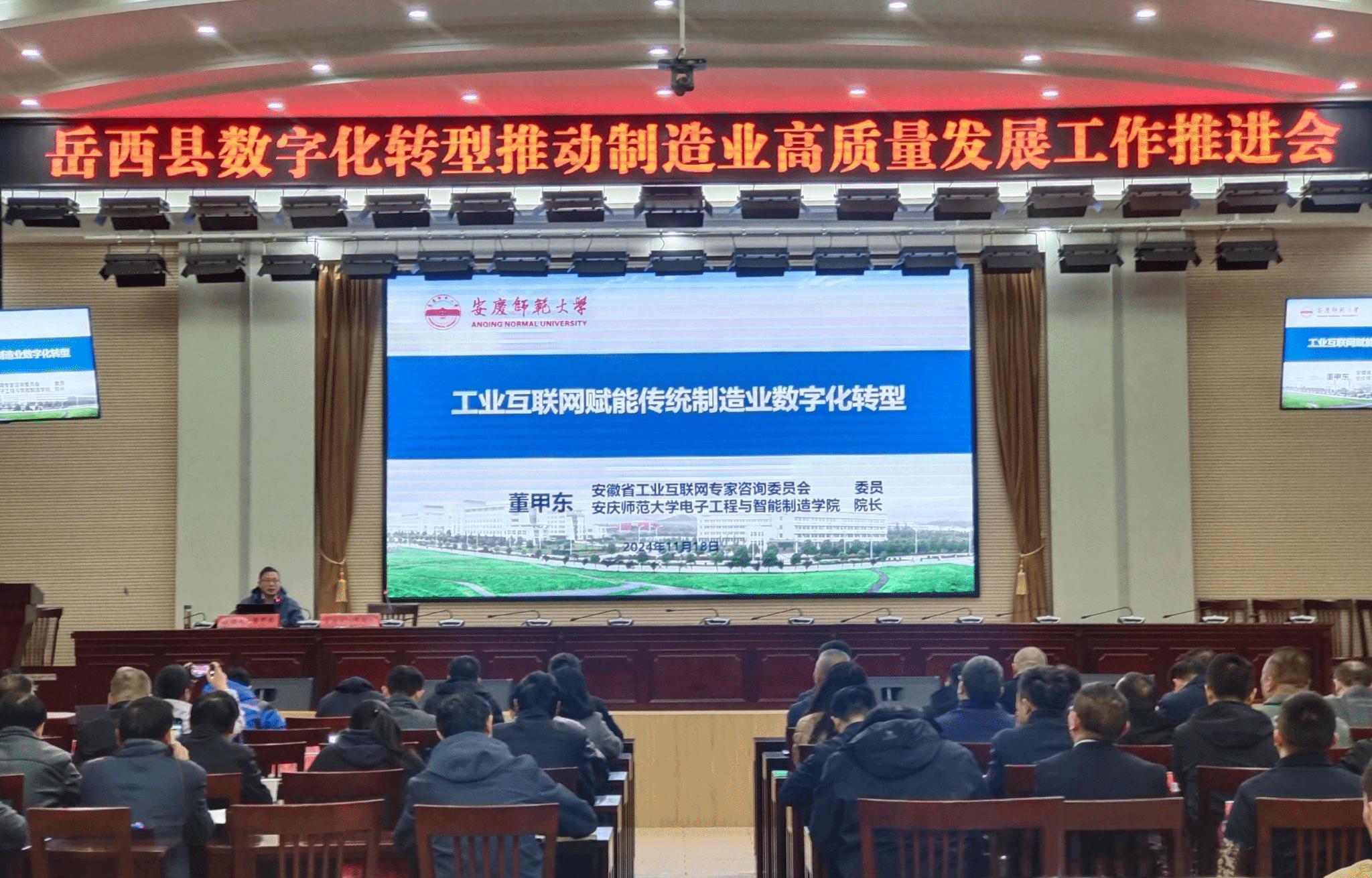 11月18日,岳西县数字化转型工作推进会在县委小礼堂举行。县委副书记、县长何斌、副县长周礼岳、县发改委、教育局、科工局等单位负责人出席会议,会议由县委常委、县政府党组成员王朝阳主持。董甲东教授应邀参加并作专题报告。