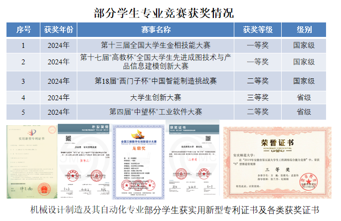本专业高度重视学生创新实践活动,专业教师积极投身于指导学生科技创作,近年来学生共发表学术论文6篇,授权实用新型专利8项,学生参加各级各类专业竞赛,近五年获得国家级、省级奖项40余项,学生攻读硕士研究生录取人数逐年增长。