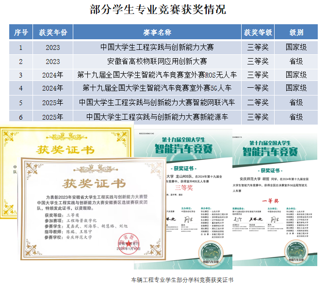本专业立足于应用型人才培养定位,注重倡导学生科学精神和创新精神培养,通过加强指导教师队伍与竞赛平台建设,将学科竞赛与学科专业紧密联系起来。近五年来,车辆工程专业学生获得国家级、省级奖项20余项。