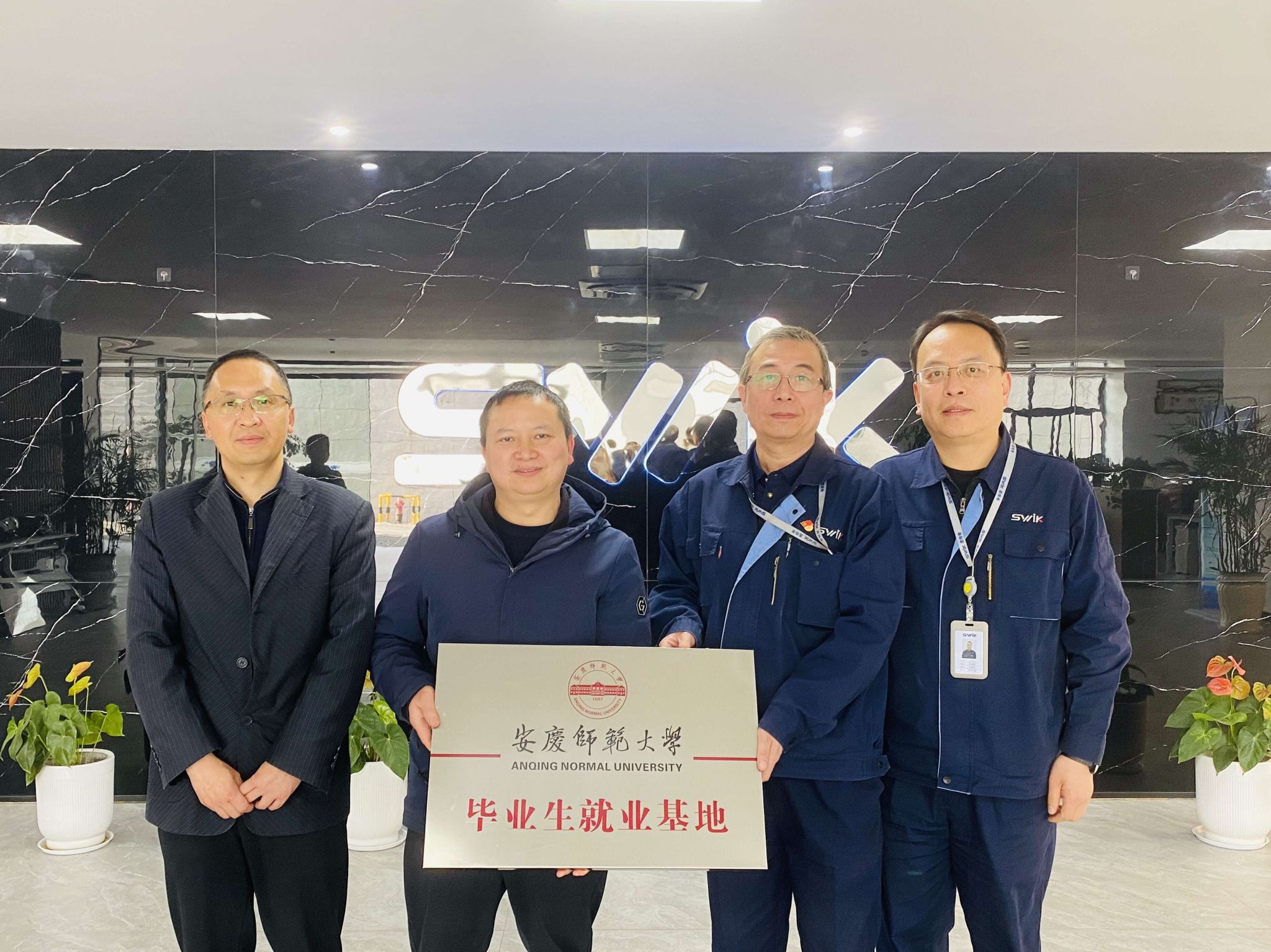 在安徽思伟奇智能科技有限公司,双方介绍了前期合作的相关情况,就学生实习实践、毕业生就业、项目合作等方面进行了深入交流并举行了毕业生就业基地签约和授牌仪式。